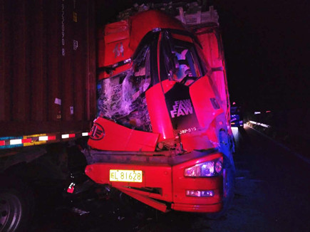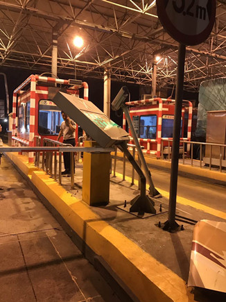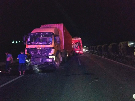 圖為被撞壞的ETC設(shè)備 當(dāng)晚事故接連不斷。晚上22點40分,臺州收費所ETC進口處,一輛大客車行李車門撞歪顯示屏,同時也撞壞了一只抓拍攝像頭,造成了較大的路產(chǎn)損失,但是當(dāng)班員工都正在路面上施救,施救中心領(lǐng)導(dǎo)統(tǒng)籌部署,通知兩位在所非當(dāng)班人員赴崗上班,緊急出動,發(fā)揮連續(xù)作戰(zhàn)精神,進行及時處理。 當(dāng)以上事故處理完畢,施救人員正準(zhǔn)備往回趕的時候,當(dāng)晚23點10分左右,四輛大貨車在寧向1667K+300M處連環(huán)追尾,其中一輛紅色大貨車車頭嚴(yán)重變形并且不斷向外漏油?,F(xiàn)場極不安全,情況危急,施救中心員工馬不停蹄,又一次拉響了救援車的警報,為了爭取時間,甚至通知了另外地點待崗的人員火速趕來,以便能及早處理。此時,施救中心當(dāng)班人員已經(jīng)全體出動,全部戰(zhàn)斗在路上。 王凱
