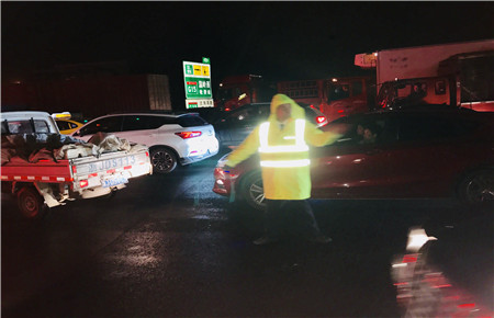 收費(fèi)員汪洋冒雨沖進(jìn)廣場,沉著冷靜指揮車輛有序進(jìn)入車道,此時(shí),駐勤人員紛紛出來協(xié)助指揮交通,迷亂雨霧中指揮秩序的熒光黃反光背心就是司乘人員的航標(biāo),指引著車輛有序平穩(wěn)地通過收費(fèi)站出口。