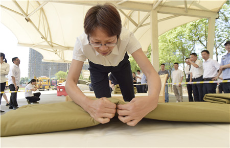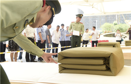 圖為教官為各位選手的“豆腐塊”裁判打分 這是集團(tuán)2018年技能大比武中內(nèi)務(wù)項(xiàng)目比賽中的一個(gè)場(chǎng)景。此次內(nèi)務(wù)比賽由公司大樓、所、中心、子公司共挑出33名代表參加,比賽特邀黃巖消防大隊(duì)兩位教官擔(dān)任裁判。