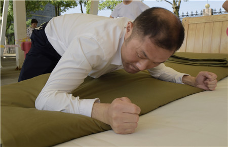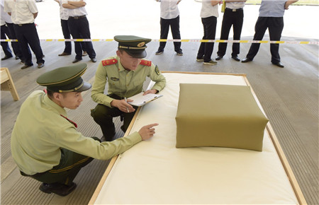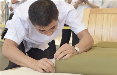 教官用手量量被子上下厚度,四周細(xì)細(xì)觀察,在兩床“豆腐塊”被子之間反復(fù)來(lái)回查看了幾遍,又與另一個(gè)教官指指點(diǎn)點(diǎn)商量了好久,不僅是參賽者,圍觀者都開(kāi)始緊張了。確實(shí),按照內(nèi)務(wù)整理要求,這兩床已被疊成豆腐塊的被子折得有棱有角,被面光滑,上下勻稱(chēng),外行人看來(lái)就是一模一樣的完美,沒(méi)有任何區(qū)別了?!白屗麄兌紩x級(jí)吧。”旁觀者說(shuō)。教官笑著搖搖頭,對(duì)大家解釋道:“3號(hào)床勝出,因?yàn)樗请p面折法,在規(guī)定時(shí)間內(nèi)兩面修整程度都一樣平整,這樣比起來(lái),5號(hào)床稍遜一籌?!?/span>